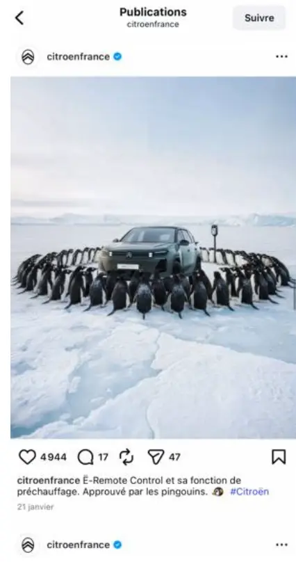 Le texte accompagnant cette image est : « Citroën France Ë-Remote Control et sa fonction de préchauffage. Approuvé par les pingouins ».