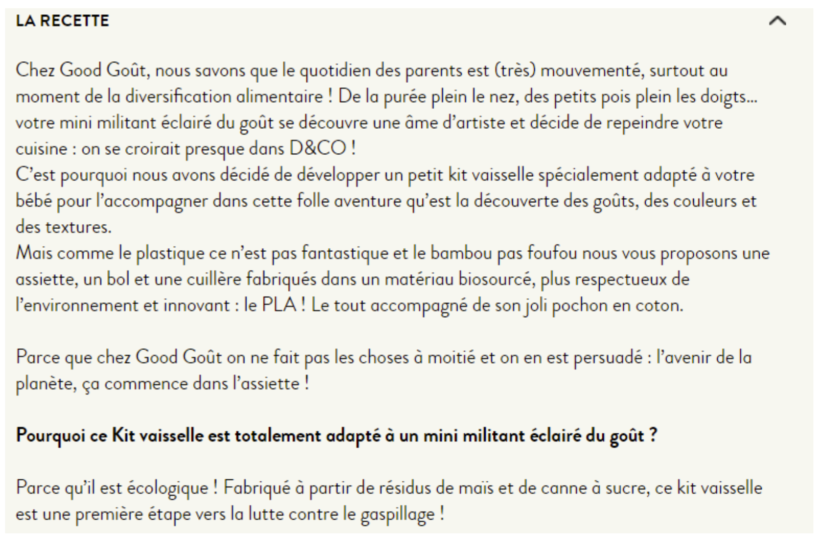 – Le plaignant énonce que le produit de la marque Good Goût, fabriqué à partir de matériaux biosourcés présente certains atouts en comparaison de ceux dérivés du pétrole par exemple, mais l’allégation « écologique » pourrait induire le public en erreur sur sa recyclabilité/compostabilité (rien n’est précisé sur la fin de vie du produit) et l’allégation aurait dû être nuancée (« plus écologique » ou « plus responsable » comme cela a été indiqué dans l’un des passages du descriptif).