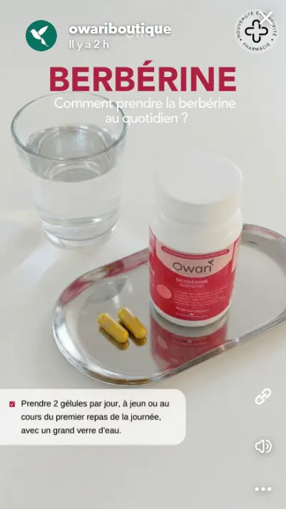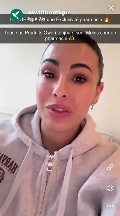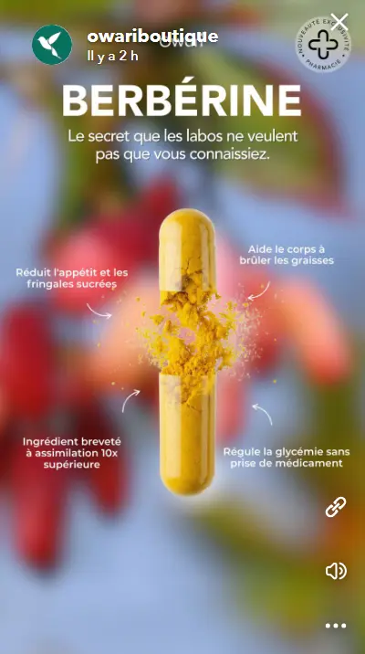 - Une publication sur Snapshat ainsi que sur le compte Instagram de la Marque Owari, dans laquelle une influenceuse (Soraya Mihya) présente le complément alimentaire Berbérine, déclarant : « Coucou, la Team Je suis trop excitée et heureuse de vous annoncer la sortie de notre nouvelle pépite, la Berbérine. Je vous explique. Vous vous souvenez, y a une grosse tendance, y a encore des personnes qui utilisent ça, c’est des injections qui de base sont faites pour des diabètes et c’est détourné pour la perte de poids. Notre pépite a le même mécanisme dont le but est de régulation d’appétit mais sans injection, sans ordonnance, sans effets secondaires, sans effet chimique, tout est 100% naturel et surtout mille fois moins cher. Concrètement, elle favorise une sensation de satiété plus rapidement, moins de fringales, la glycémie plus stable, un métabolisme beaucoup mieux régulé. En gros, le corps stocke moins, utilise mieux son énergie ce qui accompagne naturellement une perte de poids. C’est un produit, une formule naturelle Prémium hautement dosée, avec une absorbation largement supérieure aux formules classiques. Mes amours, Faut savoir que cette nouvelle pépite minceur est disponible exclusivement en Pharmacie. Je vous remets à la Une Instagram toutes les Pharmacies où le Produit est disponible, mais faut savoir que toute l’année, les produits Owari sont moins chers en Pharmacie que sur le Site. Du coup je vous laisse découvrir les 1700 points de ventes en Pharmacie où nos produits sont disponibles et des prix plus intéressants pour vous. »