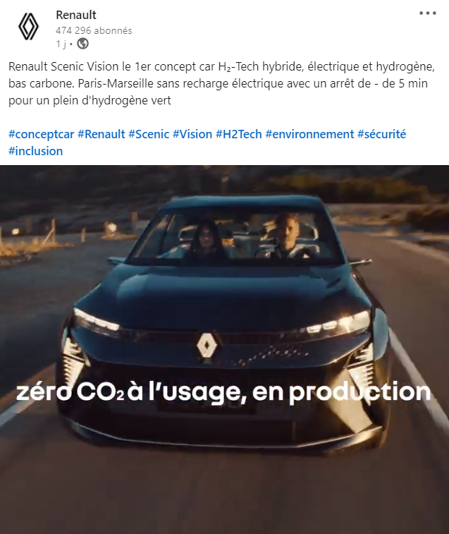 Concernant la justification de l’emploi de la mention « 0 C02 à l’usage, en production », il faut réintégrer cette mention au sein de l’intégralité du message diffusé sur la publication : «Renault Scenic Vision, plus qu’un concept car, une ambition, 1er concept car H2-tech hybride, électrique et hydrogène, zéro C02 à l’usage, en production. Réinventons Renault ».