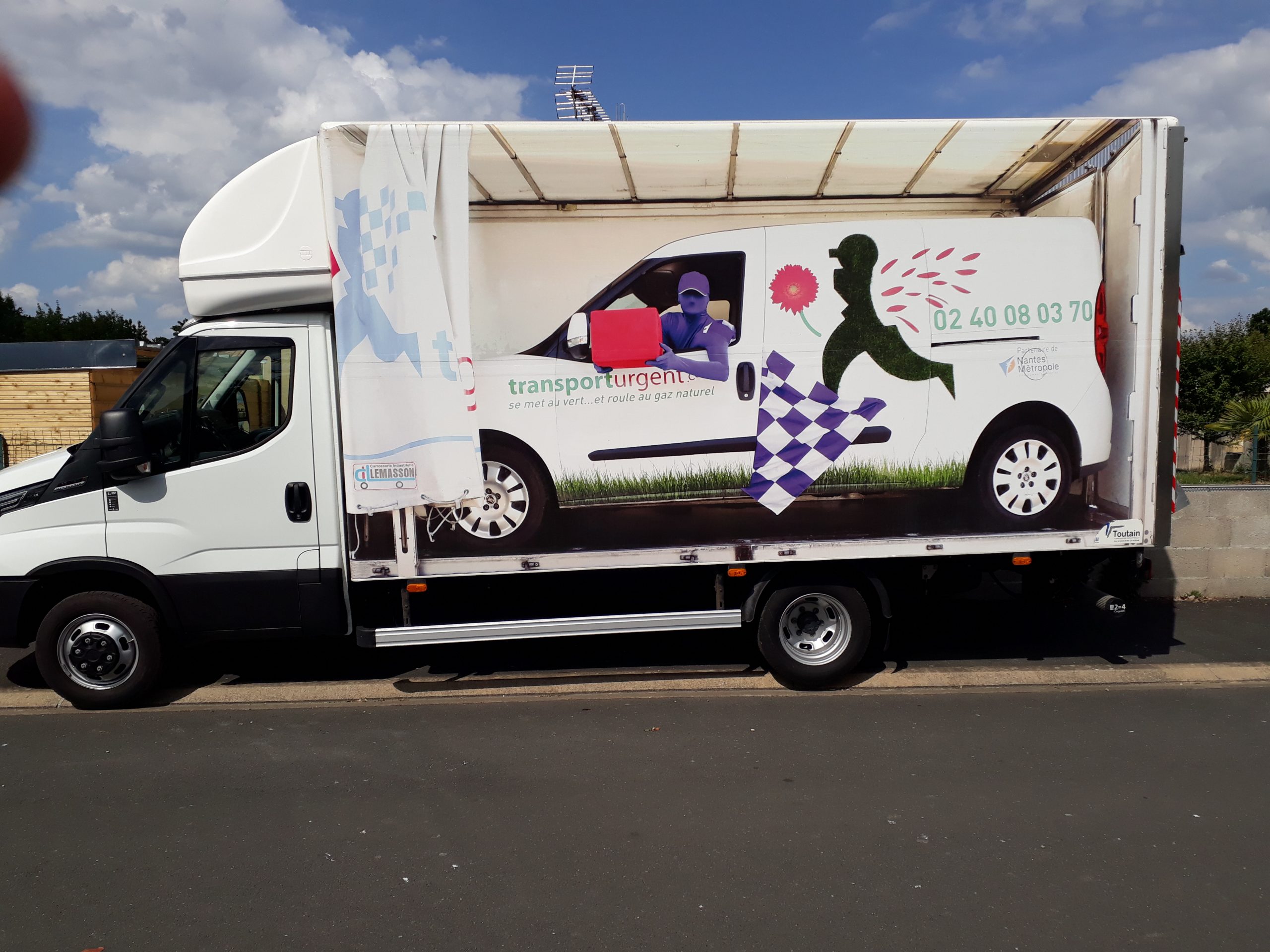 La publicité en cause, diffusée sur le flan d’un véhicule de transport de la société, lui-même positionné à l’intérieur de la remorque d’un camion indique : « transporturgent.com se met au vert… et roule au gaz naturel ».